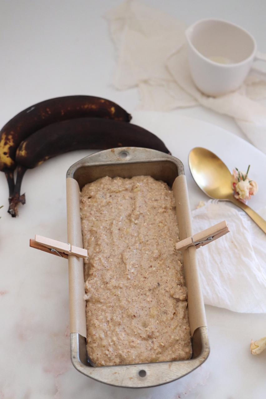 To make this banana bread recipe vegan and healthy I used gluten free oats, to make the oat flour, I also used flaxseed eggs, coconut milk, and coconut sugar, but just a little bit since bananas in my opinion are already sweet enough.